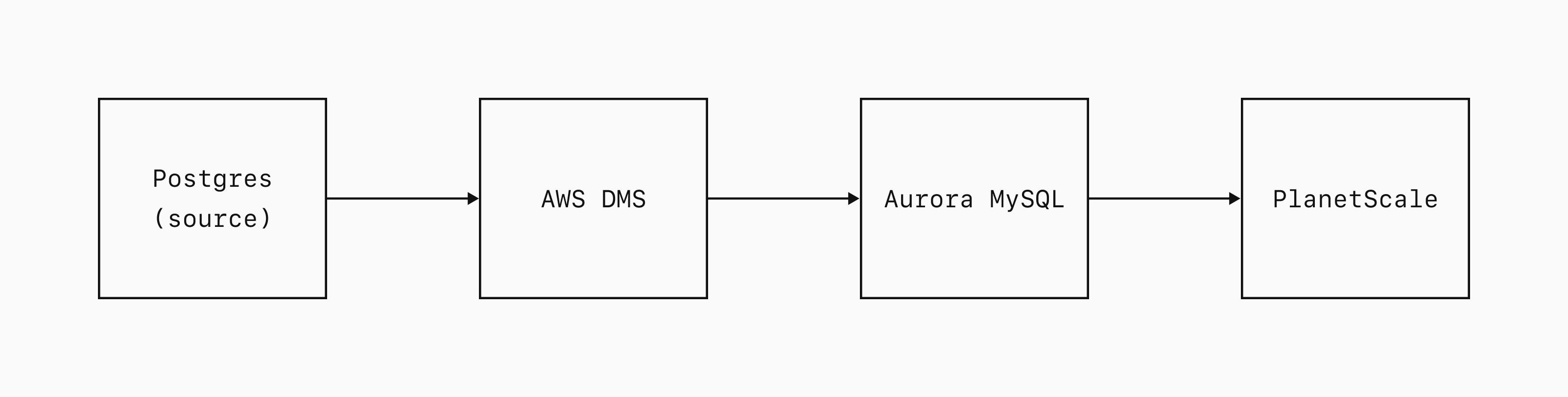 The scripts in this guide leverage AWS Database Migration Service to handle conversions between Postgres and MySQL types. It also creates a new Aurora MySQL database to use as a go-between for Postgres and PlanetScale. Even if you are migrating from a non-AWS Postgres provider, such as Neon or Supabase, you will still need an AWS account to perform the migration. When using this script, your data will take the following path:- Data flows from your Postgres source into DMS