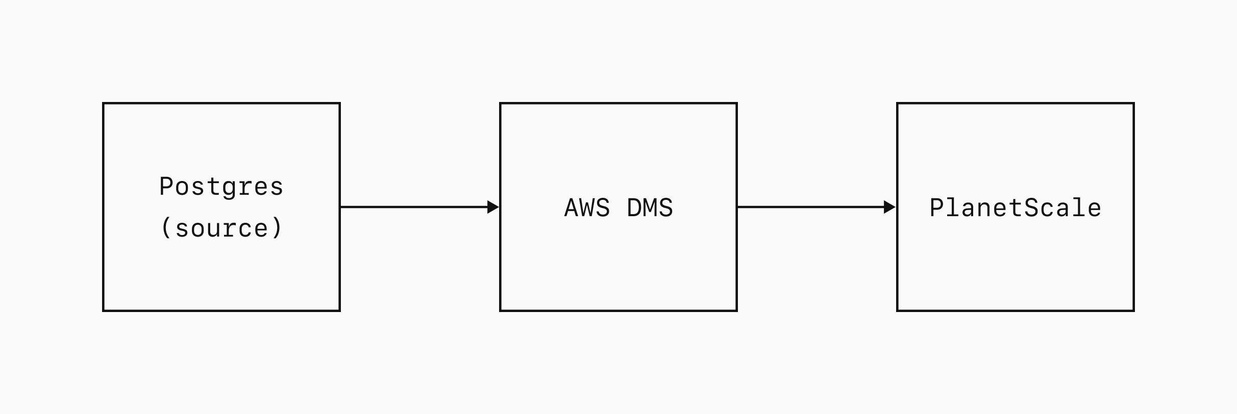 The scripts in this guide leverage AWS Database Migration Service to handle conversions between Postgres and MySQL types. Even if you are migrating from a non-AWS Postgres provider, such as Neon or Supabase, you will still need an AWS account to perform the migration. DMS acts as a middle-man between your Postgres source database and PlanetScale. All of your data will pass through the DMS server which will handle type conversions before passing the data on to your PlanetScale database. After the initial data copy, DMS will continue to replicate changes from your source to the target until you stop it. It is up to you to determine how to handle the cut over between the two in your application.